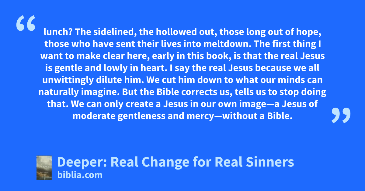 lunch? The sidelined, the hollowed out, those long out of hope, those who have sent their lives into meltdown. The first thing I want to make clear here, early in this book, is that the real Jesus is gentle and lowly in heart. I say the real Jesus because we all unwittingly dilute him. We cut him down to what our minds can naturally imagine. But the Bible corrects us, tells us to stop doing that. We can only create a Jesus in our own image—a Jesus of moderate gentleness and mercy—without a Bible.