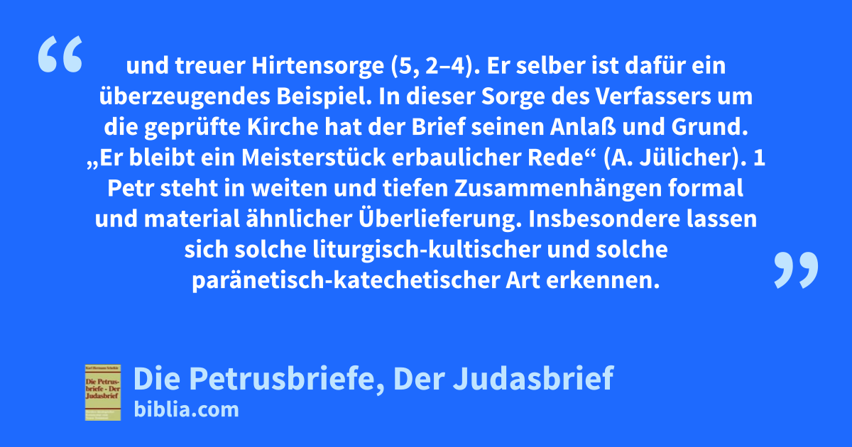 und treuer Hirtensorge (5, 2–4). Er selber ist dafür ein überzeugendes Beispiel. In dieser Sorge des Verfassers um die geprüfte Kirche hat der Brief seinen Anlaß und Grund. „Er bleibt ein Meisterstück erbaulicher Rede“ (A. Jülicher). 1 Petr steht in weiten und tiefen Zusammenhängen formal und material ähnlicher Überlieferung. Insbesondere lassen sich solche liturgisch-kultischer und solche paränetisch-katechetischer Art erkennen.