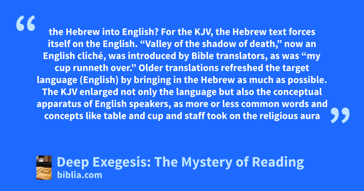 the Hebrew into English? For the KJV, the Hebrew text forces itself on the English. “Valley of the shadow of death,” now an English cliché, was introduced by Bible translators, as was “my cup runneth over.” Older translations refreshed the target language (English) by bringing in the Hebrew as much as possible. The KJV enlarged not only the language but also the conceptual apparatus of English speakers, as more or less common words and concepts like table and cup and staff took on the religious aura