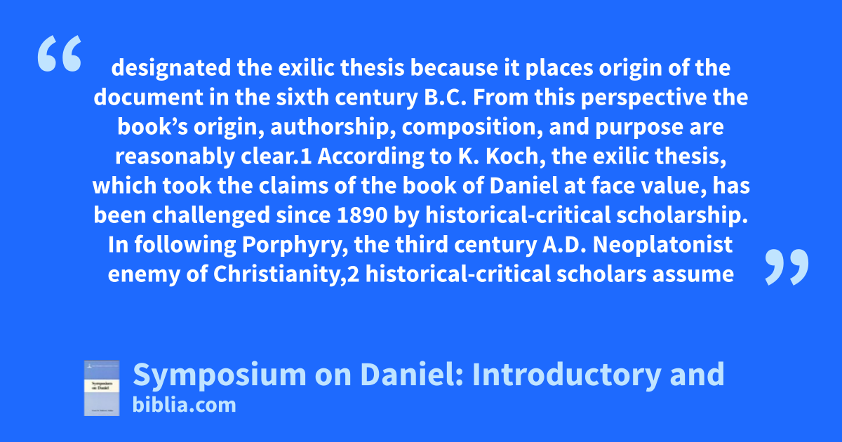 designated the exilic thesis because it places origin of the document in the sixth century B.C. From this perspective the book’s origin, authorship, composition, and purpose are reasonably clear.1 According to K. Koch, the exilic thesis, which took the claims of the book of Daniel at face value, has been challenged since 1890 by historical-critical scholarship. In following Porphyry, the third century A.D. Neoplatonist enemy of Christianity,2 historical-critical scholars assume