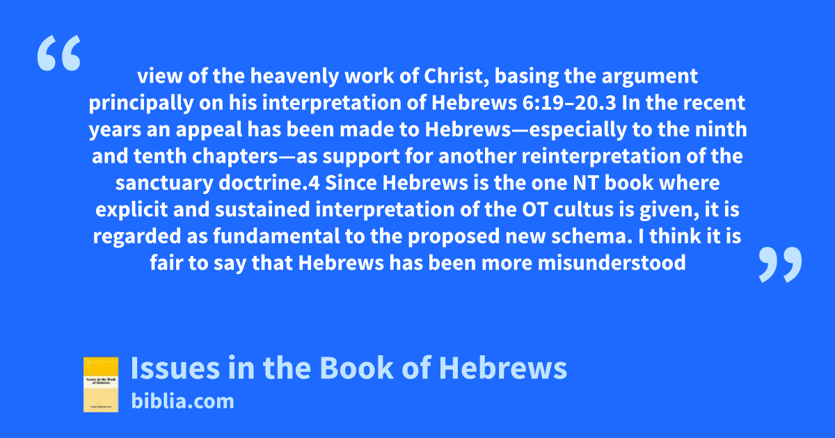This volume carefully examines major issues in the book of Hebrews, including the nature of typology and the nature, defilement, and cleansing of the heavenly sanctuary.