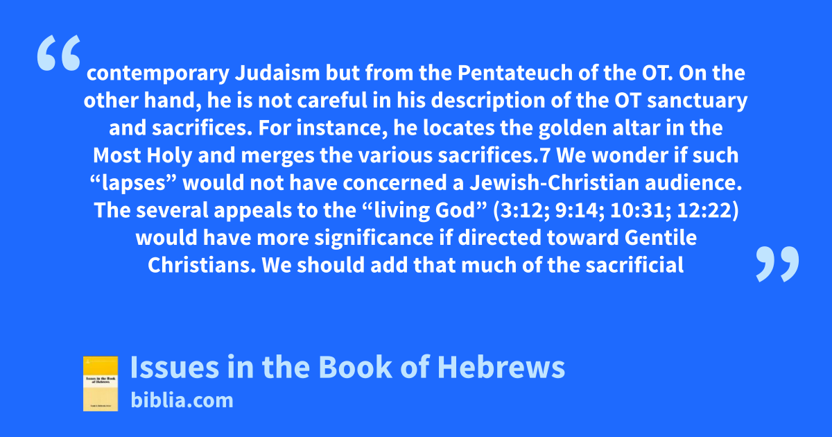 contemporary Judaism but from the Pentateuch of the OT. On the other hand, he is not careful in his description of the OT sanctuary and sacrifices. For instance, he locates the golden altar in the Most Holy and merges the various sacrifices.7 We wonder if such “lapses” would not have concerned a Jewish-Christian audience. The several appeals to the “living God” (3:12; 9:14; 10:31; 12:22) would have more significance if directed toward Gentile Christians. We should add that much of the sacrificial