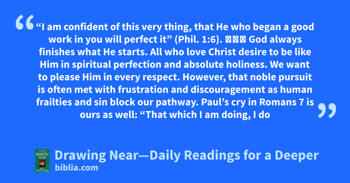 “I am confident of this very thing, that He who began a good work in you will perfect it” (Phil. 1:6). ✧✧✧ God always finishes what He starts. All who love Christ desire to be like Him in spiritual perfection and absolute holiness. We want to please Him in every respect. However, that noble pursuit is often met with frustration and discouragement as human frailties and sin block our pathway. Paul’s cry in Romans 7 is ours as well: “That which I am doing, I do