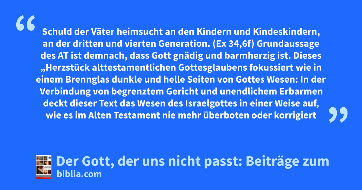 Schuld der Väter heimsucht an den Kindern und Kindeskindern, an der dritten und vierten Generation. (Ex 34,6f) Grundaussage des AT ist demnach, dass Gott gnädig und barmherzig ist. Dieses „Herzstück alttestamentlichen Gottesglaubens fokussiert wie in einem Brennglas dunkle und helle Seiten von Gottes Wesen: In der Verbindung von begrenztem Gericht und unendlichem Erbarmen deckt dieser Text das Wesen des Israelgottes in einer Weise auf, wie es im Alten Testament nie mehr überboten oder korrigiert