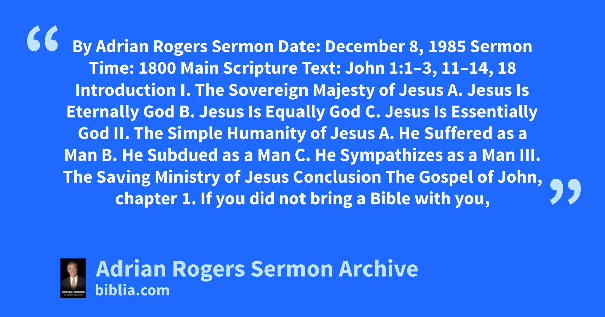 By Adrian Rogers Sermon Date: December 8, 1985 Sermon Time: 1800 Main Scripture Text: John 1:1–3, 11–14, 18 Introduction I. The Sovereign Majesty of Jesus A. Jesus Is Eternally God B. Jesus Is Equally God C. Jesus Is Essentially God II. The Simple Humanity of Jesus A. He Suffered as a Man B. He Subdued as a Man C. He Sympathizes as a Man III. The Saving Ministry of Jesus Conclusion The Gospel of John, chapter 1. If you did not bring a Bible with you,