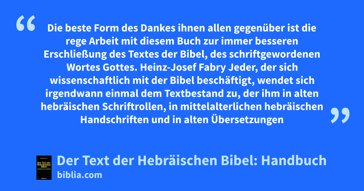 Die beste Form des Dankes ihnen allen gegenüber ist die rege Arbeit mit diesem Buch zur immer besseren Erschließung des Textes der Bibel, des schriftgewordenen Wortes Gottes. Heinz-Josef Fabry Jeder, der sich wissenschaftlich mit der Bibel beschäftigt, wendet sich irgendwann einmal dem Textbestand zu, der ihm in alten hebräischen Schriftrollen, in mittelalterlichen hebräischen Handschriften und in alten Übersetzungen