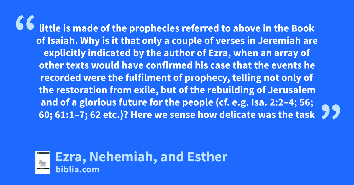 little is made of the prophecies referred to above in the Book of Isaiah. Why is it that only a couple of verses in Jeremiah are explicitly indicated by the author of Ezra, when an array of other texts would have confirmed his case that the events he recorded were the fulfilment of prophecy, telling not only of the restoration from exile, but of the rebuilding of Jerusalem and of a glorious future for the people (cf. e.g. Isa. 2:2–4; 56; 60; 61:1–7; 62 etc.)? Here we sense how delicate was the task