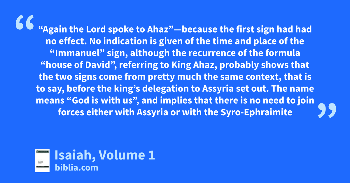 “Again the Lord spoke to Ahaz”—because the first sign had had no effect. No indication is given of the time and place of the “Immanuel” sign, although the recurrence of the formula “house of David”, referring to King Ahaz, probably shows that the two signs come from pretty much the same context, that is to say, before the king’s delegation to Assyria set out. The name means “God is with us”, and implies that there is no need to join forces either with Assyria or with the Syro-Ephraimite