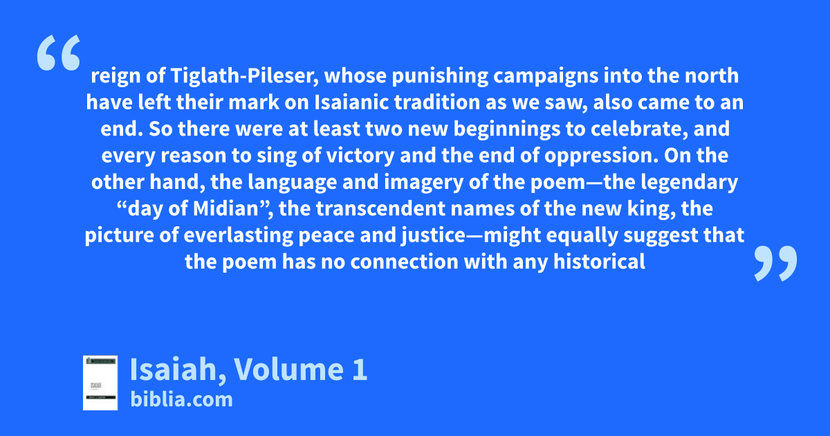 reign of Tiglath-Pileser, whose punishing campaigns into the north have left their mark on Isaianic tradition as we saw, also came to an end. So there were at least two new beginnings to celebrate, and every reason to sing of victory and the end of oppression. On the other hand, the language and imagery of the poem—the legendary “day of Midian”, the transcendent names of the new king, the picture of everlasting peace and justice—might equally suggest that the poem has no connection with any historical