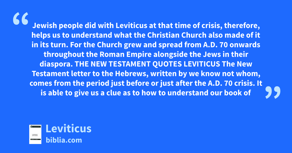 Jewish people did with Leviticus at that time of crisis, therefore, helps us to understand what the Christian Church also made of it in its turn. For the Church grew and spread from A.D. 70 onwards throughout the Roman Empire alongside the Jews in their diaspora. THE NEW TESTAMENT QUOTES LEVITICUS The New Testament letter to the Hebrews, written by we know not whom, comes from the period just before or just after the A.D. 70 crisis. It is able to give us a clue as to how to understand our book of