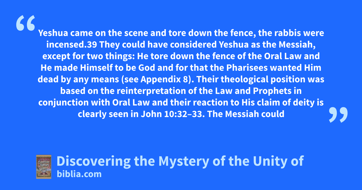 Yeshua came on the scene and tore down the fence, the rabbis were incensed.39 They could have considered Yeshua as the Messiah, except for two things: He tore down the fence of the Oral Law and He made Himself to be God and for that the Pharisees wanted Him dead by any means (see Appendix 8). Their theological position was based on the reinterpretation of the Law and Prophets in conjunction with Oral Law and their reaction to His claim of deity is clearly seen in John 10:32–33. The Messiah could