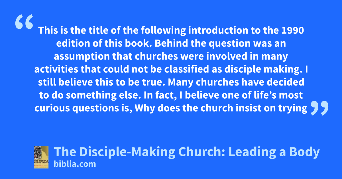 This is the title of the following introduction to the 1990 edition of this book. Behind the question was an assumption that churches were involved in many activities that could not be classified as disciple making. I still believe this to be true. Many churches have decided to do something else. In fact, I believe one of life’s most curious questions is, Why does the church insist on trying