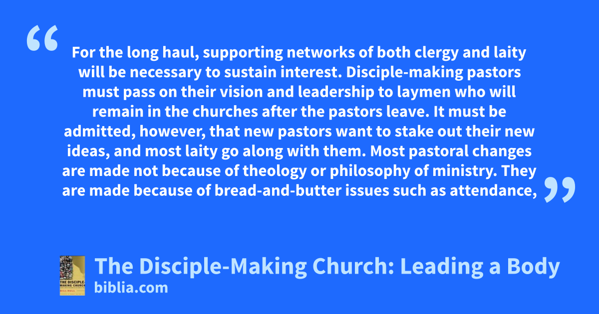 For the long haul, supporting networks of both clergy and laity will be necessary to sustain interest. Disciple-making pastors must pass on their vision and leadership to laymen who will remain in the churches after the pastors leave. It must be admitted, however, that new pastors want to stake out their new ideas, and most laity go along with them. Most pastoral changes are made not because of theology or philosophy of ministry. They are made because of bread-and-butter issues such as attendance,