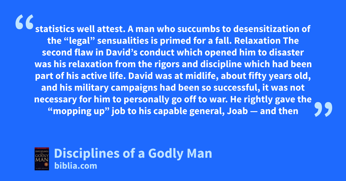 statistics well attest. A man who succumbs to desensitization of the “legal” sensualities is primed for a fall. Relaxation The second flaw in David’s conduct which opened him to disaster was his relaxation from the rigors and discipline which had been part of his active life. David was at midlife, about fifty years old, and his military campaigns had been so successful, it was not necessary for him to personally go off to war. He rightly gave the “mopping up” job to his capable general, Joab — and then