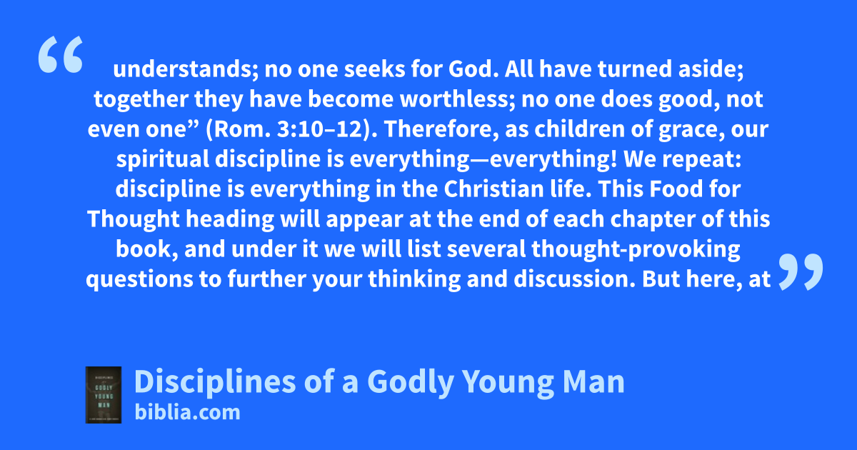 understands; no one seeks for God. All have turned aside; together they have become worthless; no one does good, not even one” (Rom. 3:10–12). Therefore, as children of grace, our spiritual discipline is everything—everything! We repeat: discipline is everything in the Christian life. This Food for Thought heading will appear at the end of each chapter of this book, and under it we will list several thought-provoking questions to further your thinking and discussion. But here, at
