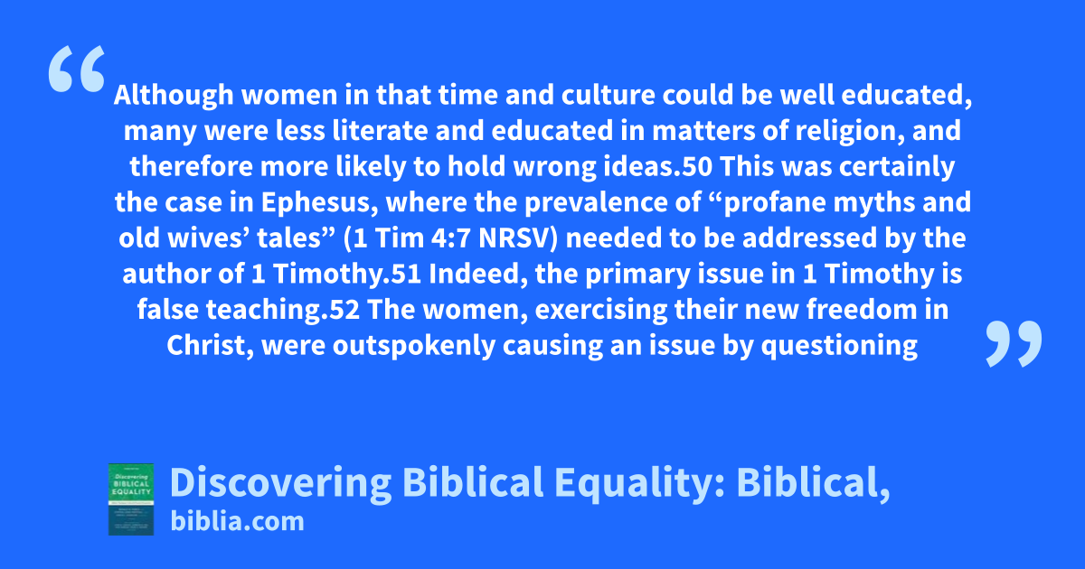 Although women in that time and culture could be well educated, many were less literate and educated in matters of religion, and therefore more likely to hold wrong ideas.50 This was certainly the case in Ephesus, where the prevalence of “profane myths and old wives’ tales” (1 Tim 4:7 NRSV) needed to be addressed by the author of 1 Timothy.51 Indeed, the primary issue in 1 Timothy is false teaching.52 The women, exercising their new freedom in Christ, were outspokenly causing an issue by questioning