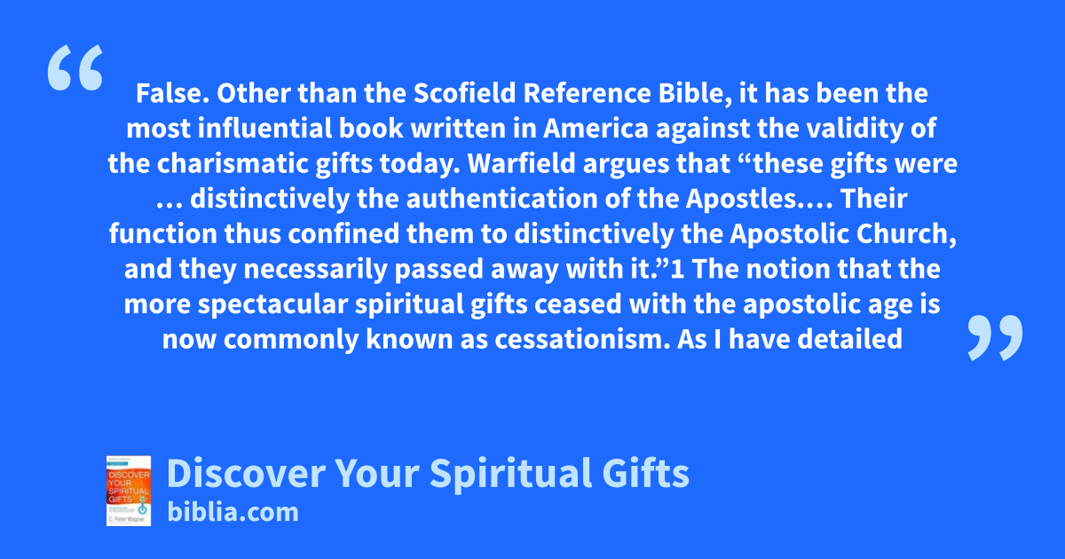 False. Other than the Scofield Reference Bible, it has been the most influential book written in America against the validity of the charismatic gifts today. Warfield argues that “these gifts were … distinctively the authentication of the Apostles.… Their function thus confined them to distinctively the Apostolic Church, and they necessarily passed away with it.”1 The notion that the more spectacular spiritual gifts ceased with the apostolic age is now commonly known as cessationism. As I have detailed