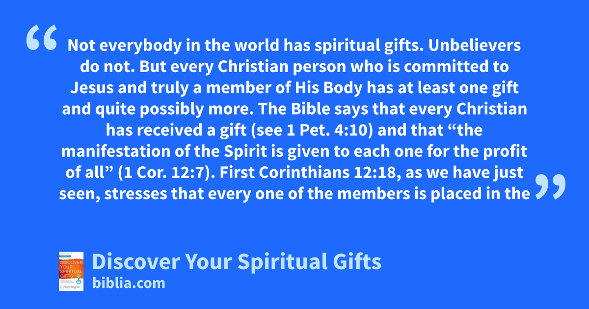 Not everybody in the world has spiritual gifts. Unbelievers do not. But every Christian person who is committed to Jesus and truly a member of His Body has at least one gift and quite possibly more. The Bible says that every Christian has received a gift (see 1 Pet. 4:10) and that “the manifestation of the Spirit is given to each one for the profit of all” (1 Cor. 12:7). First Corinthians 12:18, as we have just seen, stresses that every one of the members is placed in the