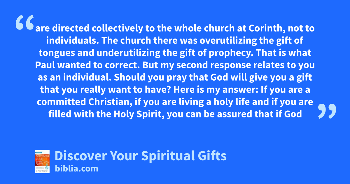 are directed collectively to the whole church at Corinth, not to individuals. The church there was overutilizing the gift of tongues and underutilizing the gift of prophecy. That is what Paul wanted to correct. But my second response relates to you as an individual. Should you pray that God will give you a gift that you really want to have? Here is my answer: If you are a committed Christian, if you are living a holy life and if you are filled with the Holy Spirit, you can be assured that if God