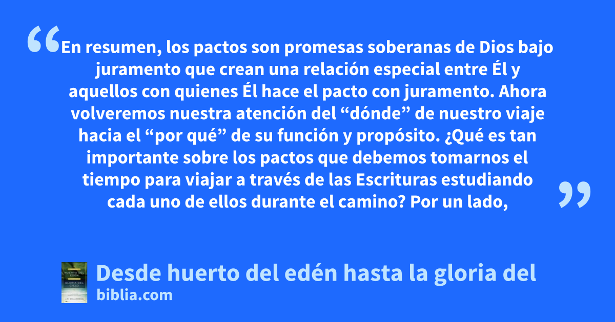 En resumen, los pactos son promesas soberanas de Dios bajo juramento que crean una relación especial entre Él y aquellos con quienes Él hace el pacto con juramento. Ahora volveremos nuestra atención del “dónde” de nuestro viaje hacia el “por qué” de su función y propósito. ¿Qué es tan importante sobre los pactos que debemos tomarnos el tiempo para viajar a través de las Escrituras estudiando cada uno de ellos durante el camino? Por un lado,