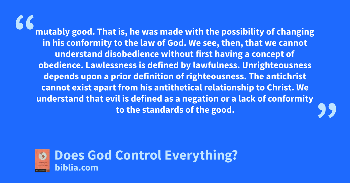 mutably good. That is, he was made with the possibility of changing in his conformity to the law of God. We see, then, that we cannot understand disobedience without first having a concept of obedience. Lawlessness is defined by lawfulness. Unrighteousness depends upon a prior definition of righteousness. The antichrist cannot exist apart from his antithetical relationship to Christ. We understand that evil is defined as a negation or a lack of conformity to the standards of the good.