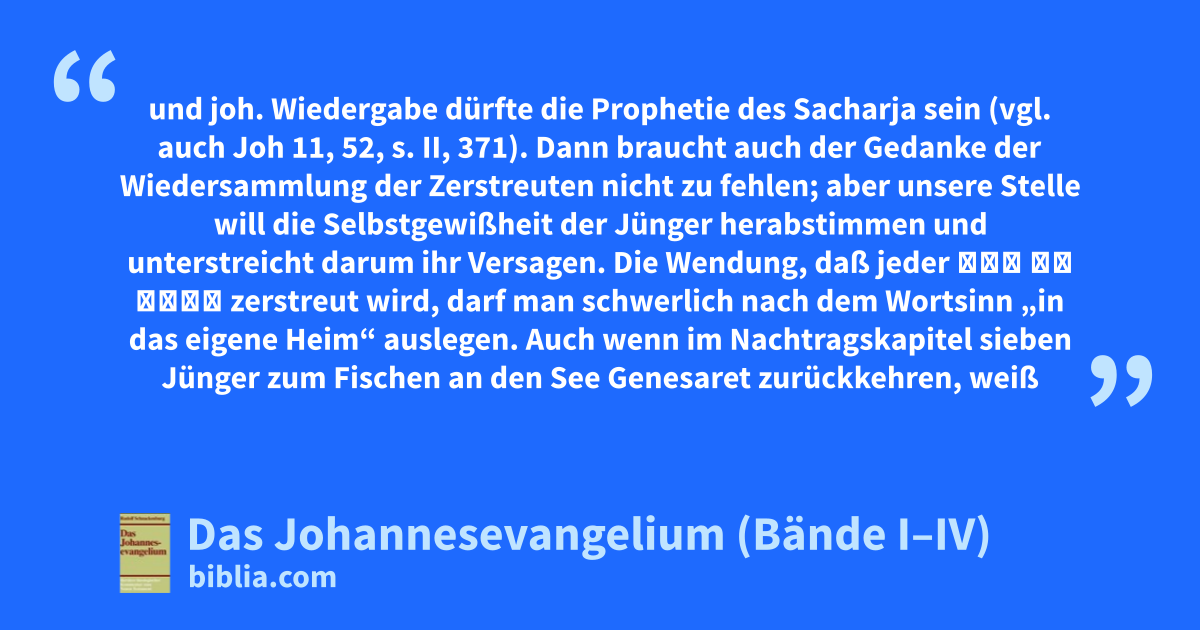 und joh. Wiedergabe dürfte die Prophetie des Sacharja sein (vgl. auch Joh 11, 52, s. II, 371). Dann braucht auch der Gedanke der Wiedersammlung der Zerstreuten nicht zu fehlen; aber unsere Stelle will die Selbstgewißheit der Jünger herabstimmen und unterstreicht darum ihr Versagen. Die Wendung, daß jeder εἰς τὰ ἴδια zerstreut wird, darf man schwerlich nach dem Wortsinn „in das eigene Heim“ auslegen. Auch wenn im Nachtragskapitel sieben Jünger zum Fischen an den See Genesaret zurückkehren, weiß