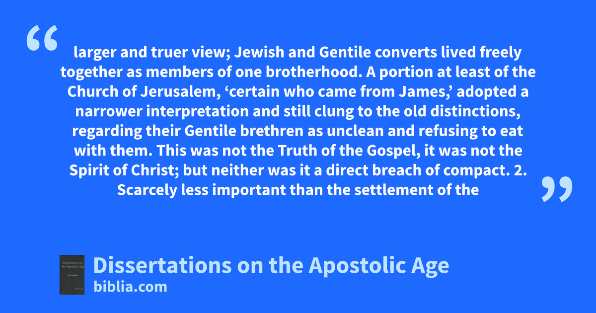 larger and truer view; Jewish and Gentile converts lived freely together as members of one brotherhood. A portion at least of the Church of Jerusalem, ‘certain who came from James,’ adopted a narrower interpretation and still clung to the old distinctions, regarding their Gentile brethren as unclean and refusing to eat with them. This was not the Truth of the Gospel, it was not the Spirit of Christ; but neither was it a direct breach of compact. 2. Scarcely less important than the settlement of the