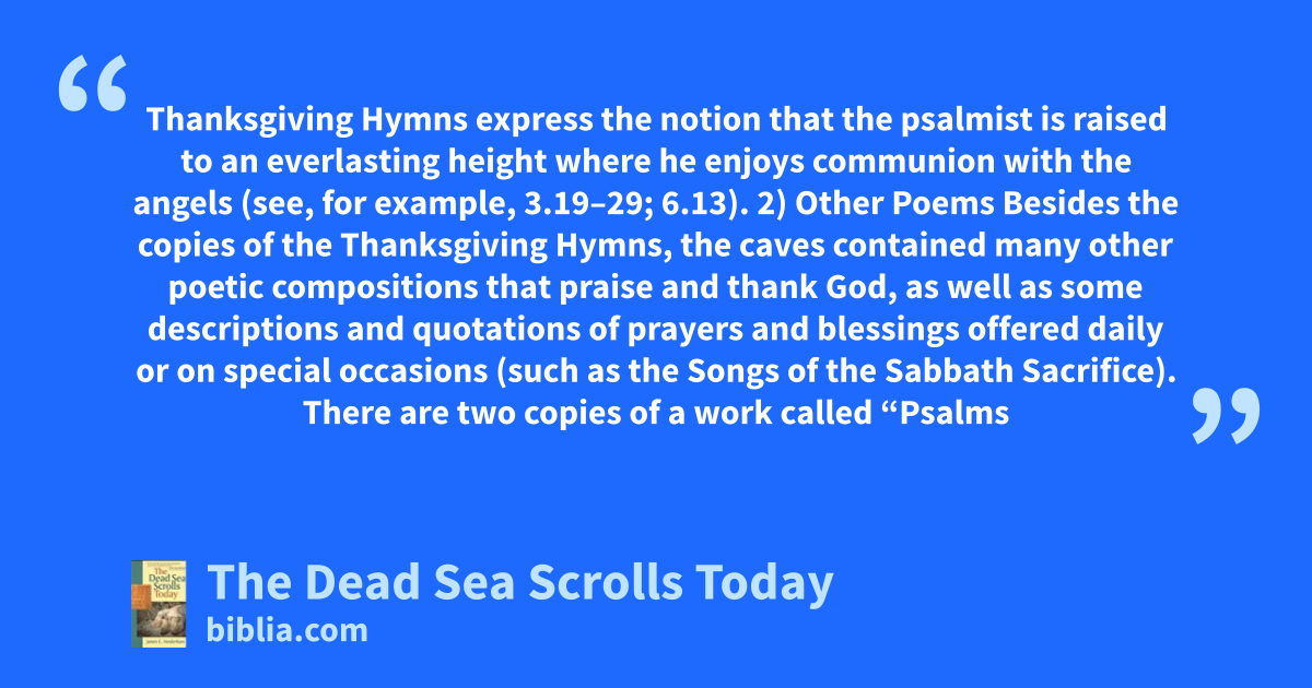 Thanksgiving Hymns express the notion that the psalmist is raised to an everlasting height where he enjoys communion with the angels (see, for example, 3.19–29; 6.13). 2) Other Poems Besides the copies of the Thanksgiving Hymns, the caves contained many other poetic compositions that praise and thank God, as well as some descriptions and quotations of prayers and blessings offered daily or on special occasions (such as the Songs of the Sabbath Sacrifice). There are two copies of a work called “Psalms