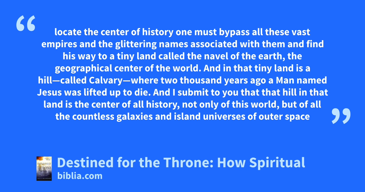 locate the center of history one must bypass all these vast empires and the glittering names associated with them and find his way to a tiny land called the navel of the earth, the geographical center of the world. And in that tiny land is a hill—called Calvary—where two thousand years ago a Man named Jesus was lifted up to die. And I submit to you that that hill in that land is the center of all history, not only of this world, but of all the countless galaxies and island universes of outer space