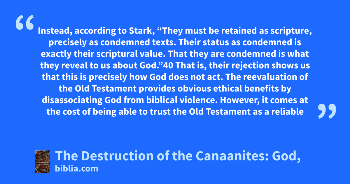 Instead, according to Stark, “They must be retained as scripture, precisely as condemned texts. Their status as condemned is exactly their scriptural value. That they are condemned is what they reveal to us about God.”40 That is, their rejection shows us that this is precisely how God does not act. The reevaluation of the Old Testament provides obvious ethical benefits by disassociating God from biblical violence. However, it comes at the cost of being able to trust the Old Testament as a reliable