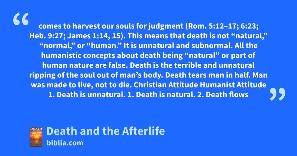 comes to harvest our souls for judgment (Rom. 5:12–17; 6:23; Heb. 9:27; James 1:14, 15). This means that death is not “natural,” “normal,” or “human.” It is unnatural and subnormal. All the humanistic concepts about death being “natural” or part of human nature are false. Death is the terrible and unnatural ripping of the soul out of man’s body. Death tears man in half. Man was made to live, not to die. Christian Attitude Humanist Attitude 1. Death is unnatural. 1. Death is natural. 2. Death flows