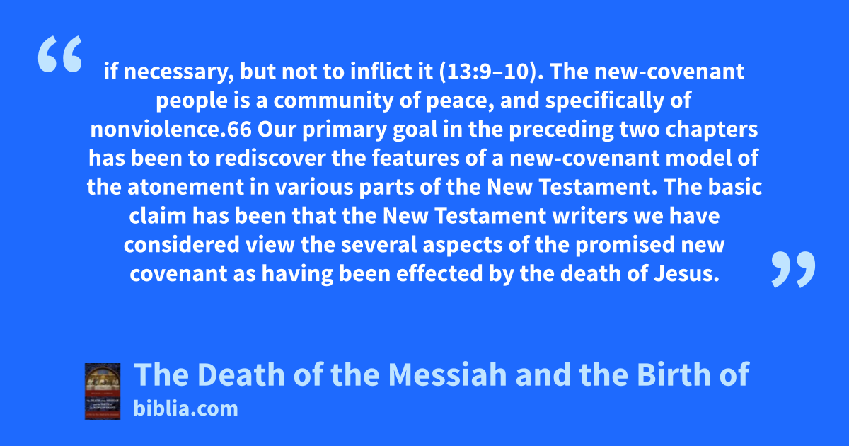 if necessary, but not to inflict it (13:9–10). The new-covenant people is a community of peace, and specifically of nonviolence.66 Our primary goal in the preceding two chapters has been to rediscover the features of a new-covenant model of the atonement in various parts of the New Testament. The basic claim has been that the New Testament writers we have considered view the several aspects of the promised new covenant as having been effected by the death of Jesus.