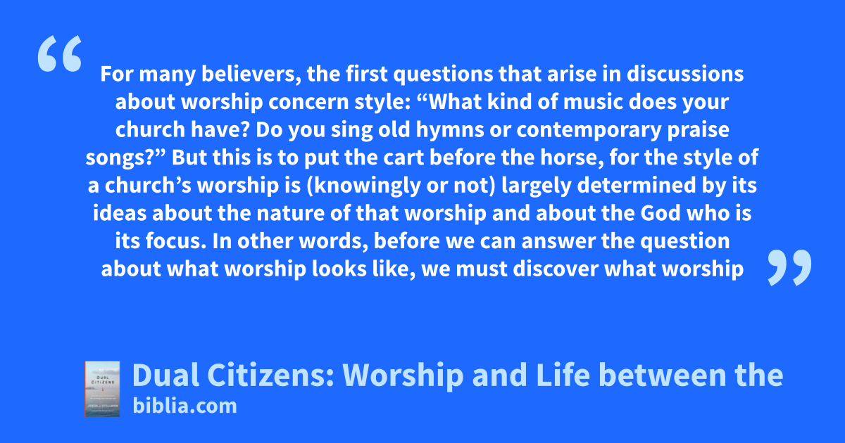 For many believers, the first questions that arise in discussions about worship concern style: “What kind of music does your church have? Do you sing old hymns or contemporary praise songs?” But this is to put the cart before the horse, for the style of a church’s worship is (knowingly or not) largely determined by its ideas about the nature of that worship and about the God who is its focus. In other words, before we can answer the question about what worship looks like, we must discover what worship