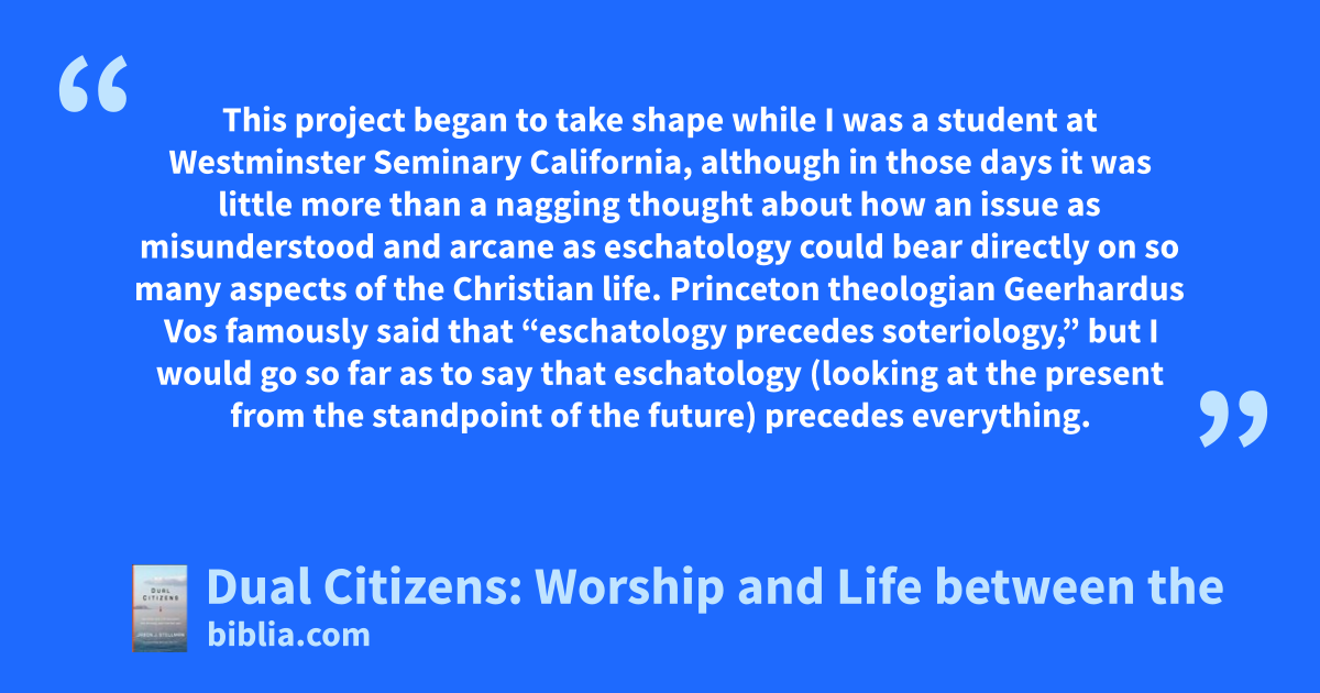 This project began to take shape while I was a student at Westminster Seminary California, although in those days it was little more than a nagging thought about how an issue as misunderstood and arcane as eschatology could bear directly on so many aspects of the Christian life. Princeton theologian Geerhardus Vos famously said that “eschatology precedes soteriology,” but I would go so far as to say that eschatology (looking at the present from the standpoint of the future) precedes everything.