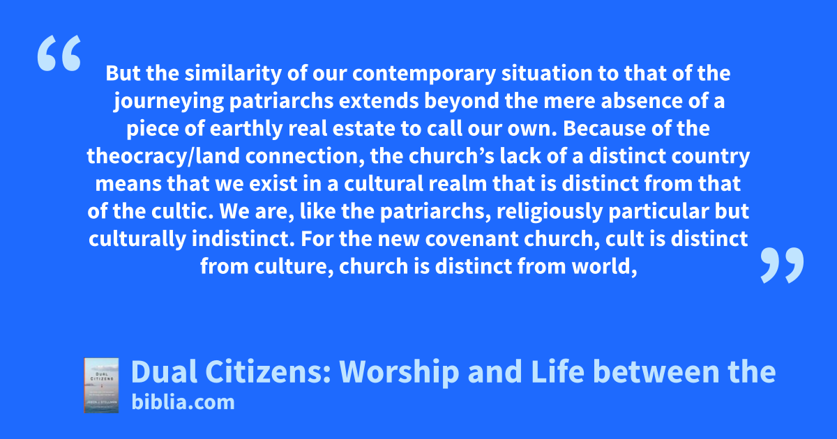 But the similarity of our contemporary situation to that of the journeying patriarchs extends beyond the mere absence of a piece of earthly real estate to call our own. Because of the theocracy/land connection, the church’s lack of a distinct country means that we exist in a cultural realm that is distinct from that of the cultic. We are, like the patriarchs, religiously particular but culturally indistinct. For the new covenant church, cult is distinct from culture, church is distinct from world,