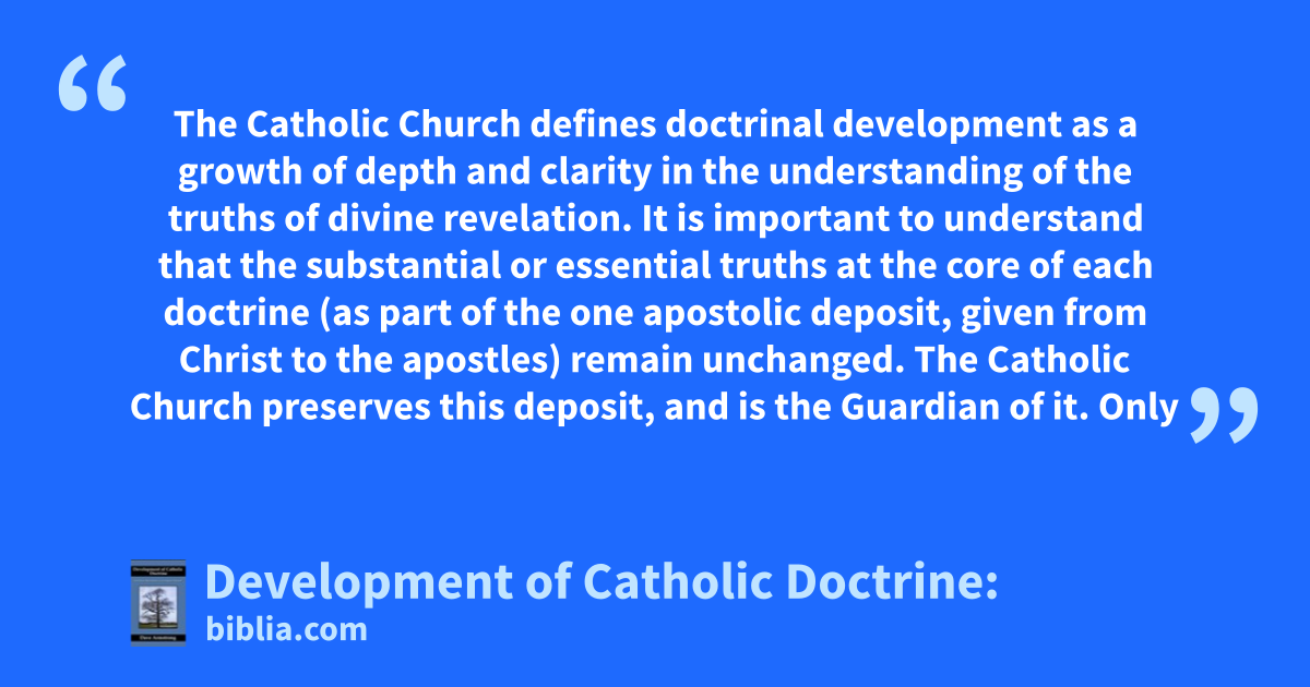 The Catholic Church defines doctrinal development as a growth of depth and clarity in the understanding of the truths of divine revelation. It is important to understand that the substantial or essential truths at the core of each doctrine (as part of the one apostolic deposit, given from Christ to the apostles) remain unchanged. The Catholic Church preserves this deposit, and is the Guardian of it. Only