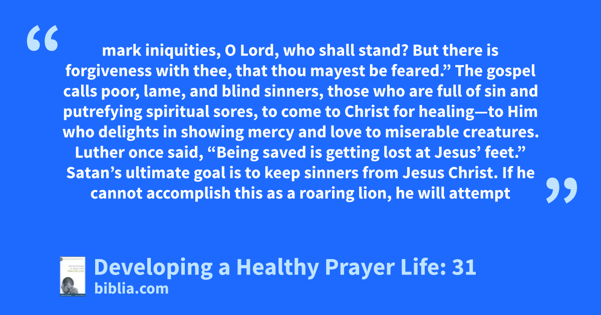 mark iniquities, O Lord, who shall stand? But there is forgiveness with thee, that thou mayest be feared.” The gospel calls poor, lame, and blind sinners, those who are full of sin and putrefying spiritual sores, to come to Christ for healing—to Him who delights in showing mercy and love to miserable creatures. Luther once said, “Being saved is getting lost at Jesus’ feet.” Satan’s ultimate goal is to keep sinners from Jesus Christ. If he cannot accomplish this as a roaring lion, he will attempt