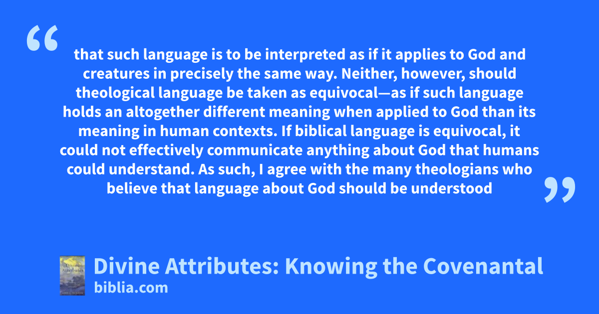 that such language is to be interpreted as if it applies to God and creatures in precisely the same way. Neither, however, should theological language be taken as equivocal—as if such language holds an altogether different meaning when applied to God than its meaning in human contexts. If biblical language is equivocal, it could not effectively communicate anything about God that humans could understand. As such, I agree with the many theologians who believe that language about God should be understood