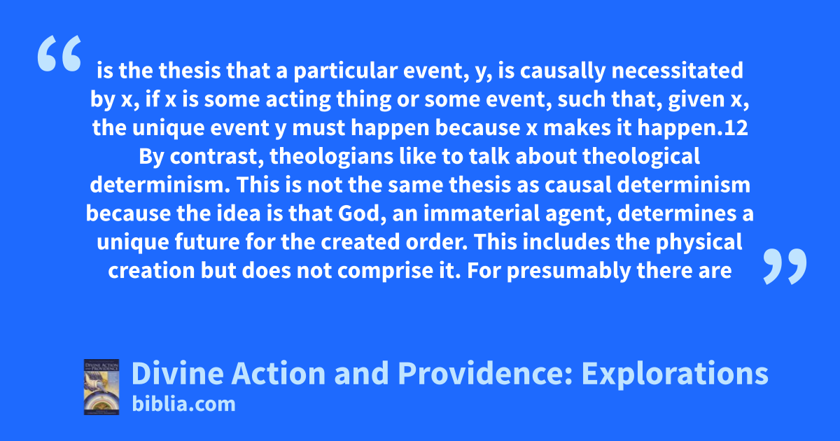 is the thesis that a particular event, y, is causally necessitated by x, if x is some acting thing or some event, such that, given x, the unique event y must happen because x makes it happen.12 By contrast, theologians like to talk about theological determinism. This is not the same thesis as causal determinism because the idea is that God, an immaterial agent, determines a unique future for the created order. This includes the physical creation but does not comprise it. For presumably there are