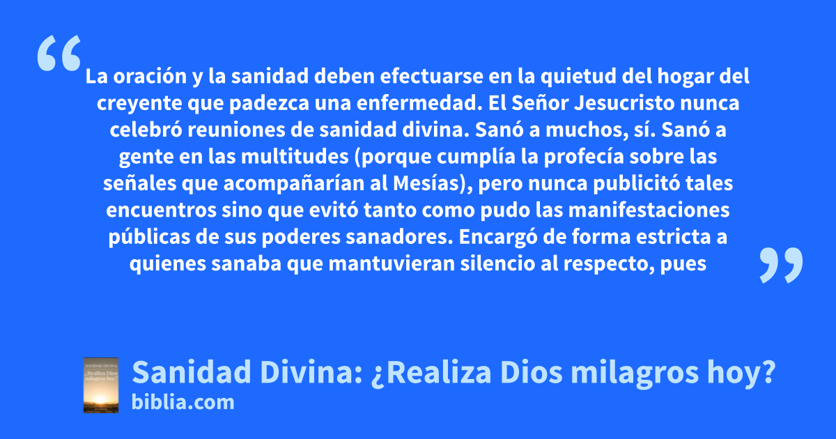 La oración y la sanidad deben efectuarse en la quietud del hogar del creyente que padezca una enfermedad. El Señor Jesucristo nunca celebró reuniones de sanidad divina. Sanó a muchos, sí. Sanó a gente en las multitudes (porque cumplía la profecía sobre las señales que acompañarían al Mesías), pero nunca publicitó tales encuentros sino que evitó tanto como pudo las manifestaciones públicas de sus poderes sanadores. Encargó de forma estricta a quienes sanaba que mantuvieran silencio al respecto, pues