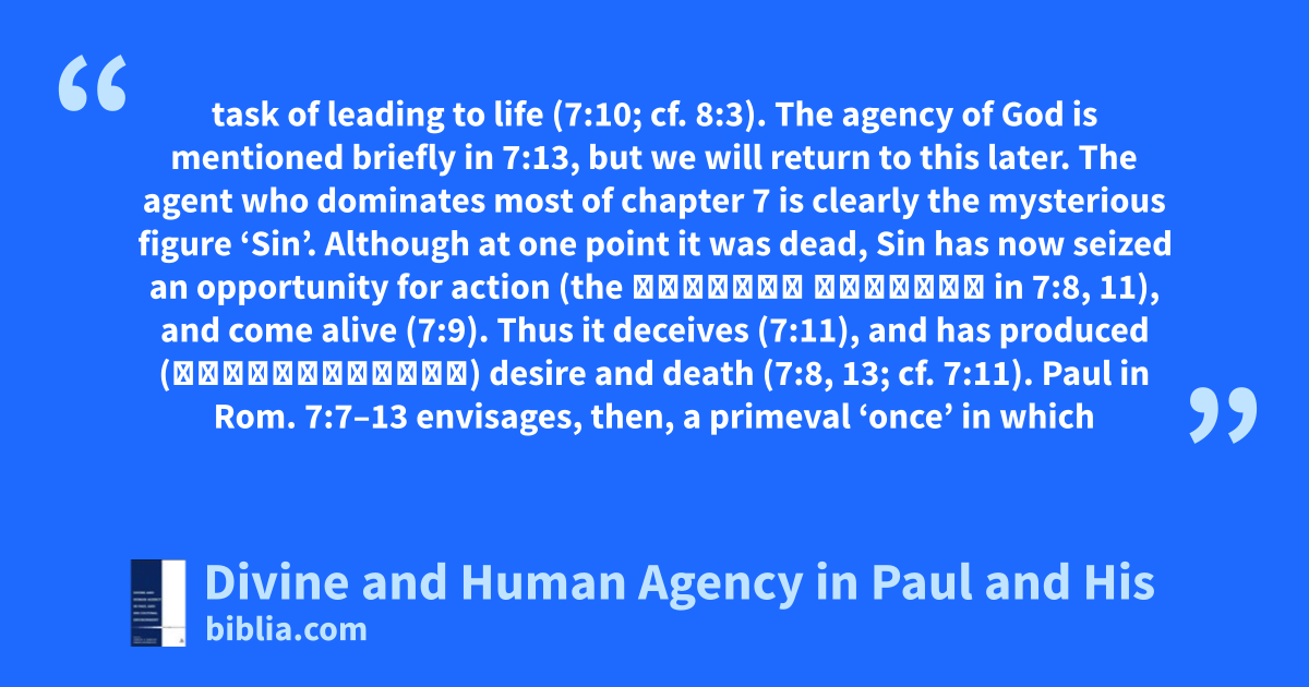 task of leading to life (7:10; cf. 8:3). The agency of God is mentioned briefly in 7:13, but we will return to this later. The agent who dominates most of chapter 7 is clearly the mysterious figure ‘Sin’. Although at one point it was dead, Sin has now seized an opportunity for action (the ἀφορμὴν λαβοῦσα in 7:8, 11), and come alive (7:9). Thus it deceives (7:11), and has produced (κατειργάσατο) desire and death (7:8, 13; cf. 7:11). Paul in Rom. 7:7–13 envisages, then, a primeval ‘once’ in which