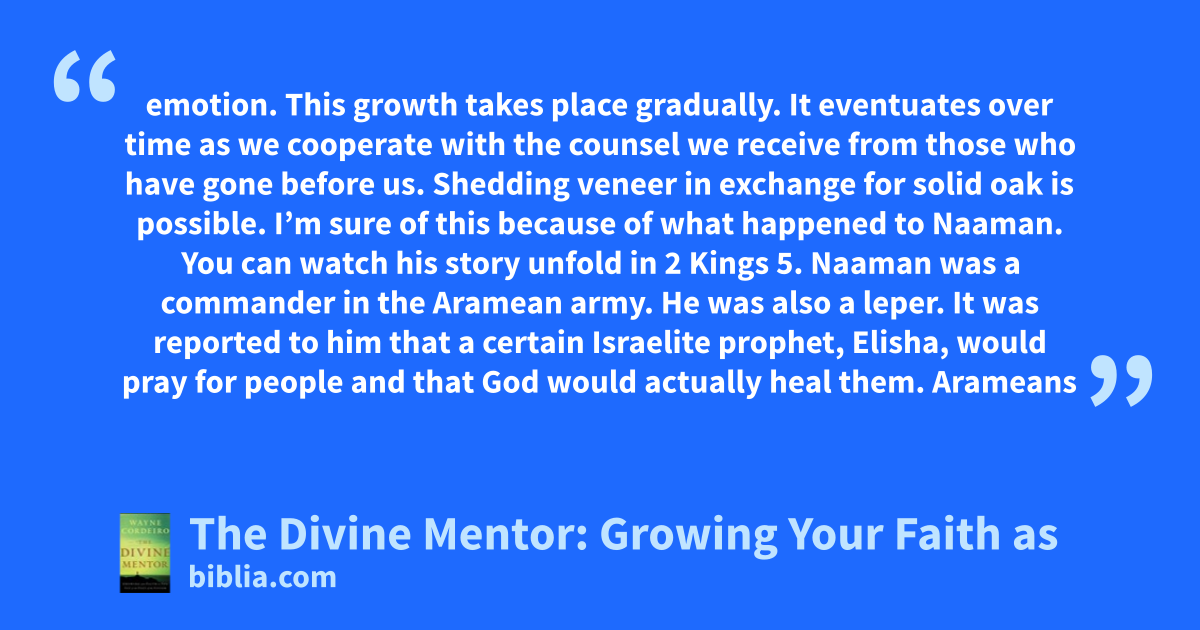 emotion. This growth takes place gradually. It eventuates over time as we cooperate with the counsel we receive from those who have gone before us. Shedding veneer in exchange for solid oak is possible. I’m sure of this because of what happened to Naaman. You can watch his story unfold in 2 Kings 5. Naaman was a commander in the Aramean army. He was also a leper. It was reported to him that a certain Israelite prophet, Elisha, would pray for people and that God would actually heal them. Arameans