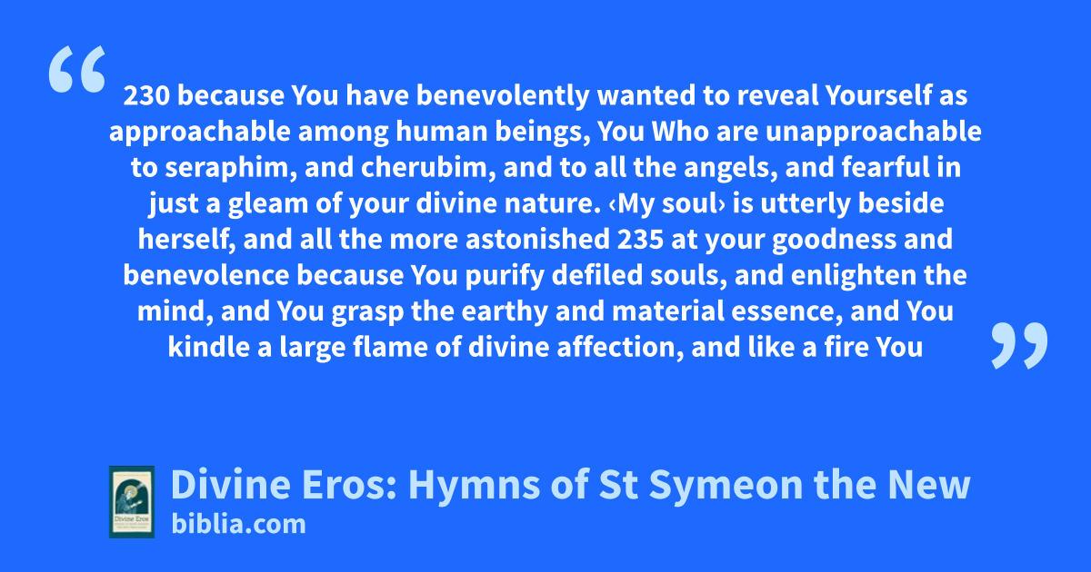 230 because You have benevolently wanted to reveal Yourself as approachable among human beings, You Who are unapproachable to seraphim, and cherubim, and to all the angels, and fearful in just a gleam of your divine nature. ‹My soul› is utterly beside herself, and all the more astonished 235 at your goodness and benevolence because You purify defiled souls, and enlighten the mind, and You grasp the earthy and material essence, and You kindle a large flame of divine affection, and like a fire You