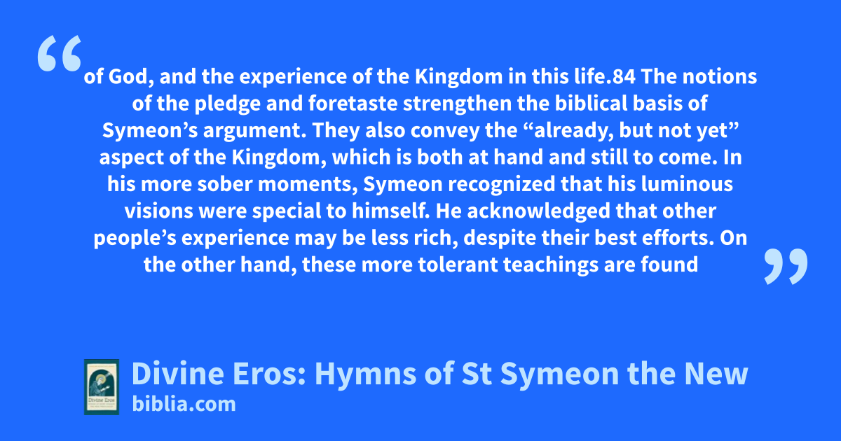of God, and the experience of the Kingdom in this life.84 The notions of the pledge and foretaste strengthen the biblical basis of Symeon’s argument. They also convey the “already, but not yet” aspect of the Kingdom, which is both at hand and still to come. In his more sober moments, Symeon recognized that his luminous visions were special to himself. He acknowledged that other people’s experience may be less rich, despite their best efforts. On the other hand, these more tolerant teachings are found