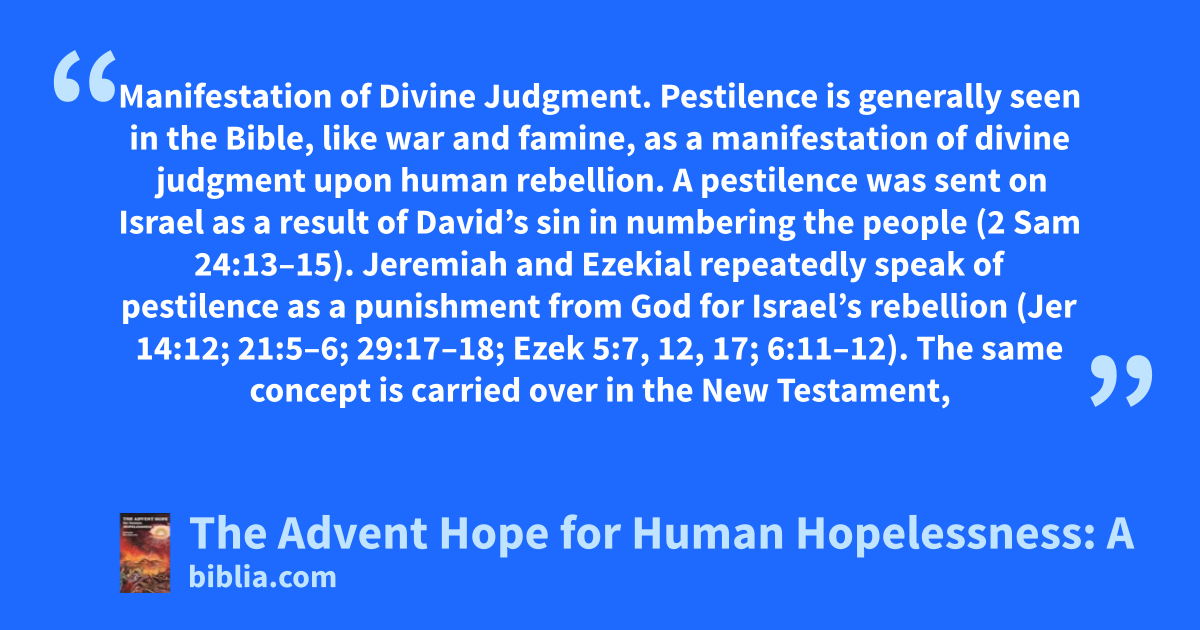 Manifestation of Divine Judgment. Pestilence is generally seen in the Bible, like war and famine, as a manifestation of divine judgment upon human rebellion. A pestilence was sent on Israel as a result of David’s sin in numbering the people (2 Sam 24:13–15). Jeremiah and Ezekial repeatedly speak of pestilence as a punishment from God for Israel’s rebellion (Jer 14:12; 21:5–6; 29:17–18; Ezek 5:7, 12, 17; 6:11–12). The same concept is carried over in the New Testament,
