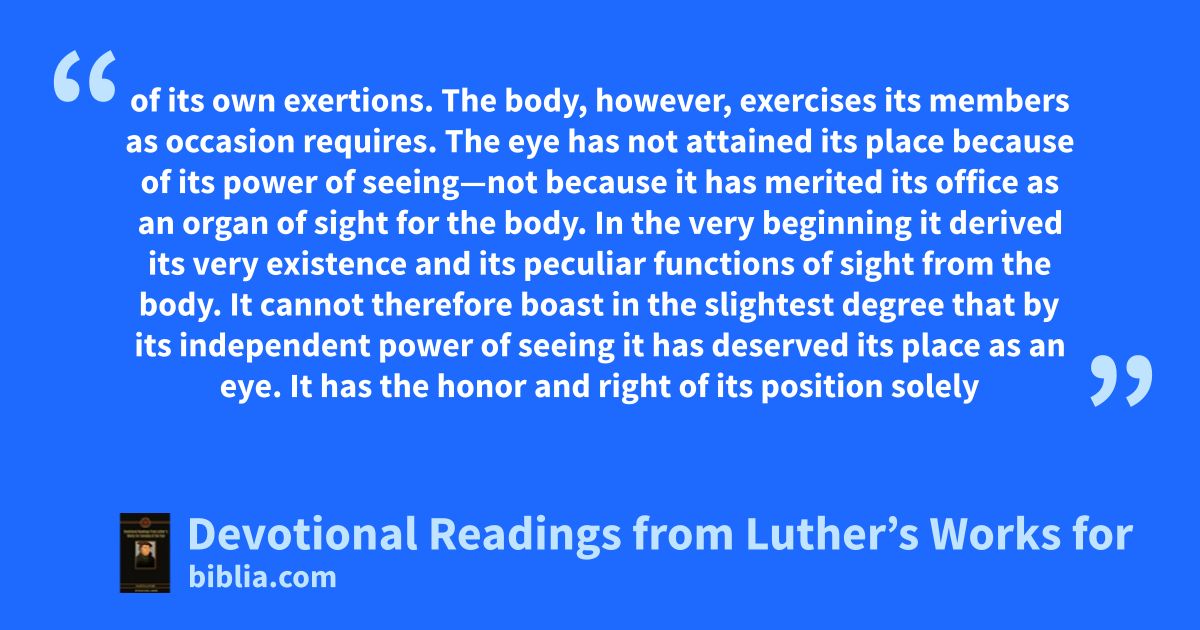 of its own exertions. The body, however, exercises its members as occasion requires. The eye has not attained its place because of its power of seeing—not because it has merited its office as an organ of sight for the body. In the very beginning it derived its very existence and its peculiar functions of sight from the body. It cannot therefore boast in the slightest degree that by its independent power of seeing it has deserved its place as an eye. It has the honor and right of its position solely