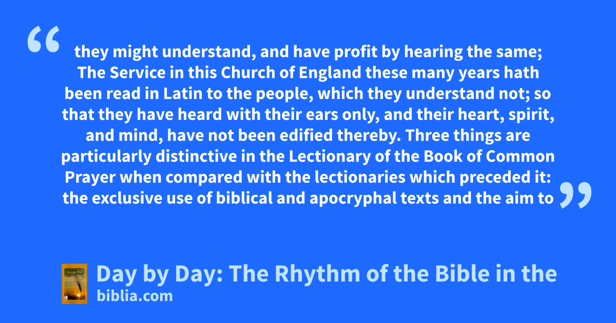 they might understand, and have profit by hearing the same; The Service in this Church of England these many years hath been read in Latin to the people, which they understand not; so that they have heard with their ears only, and their heart, spirit, and mind, have not been edified thereby. Three things are particularly distinctive in the Lectionary of the Book of Common Prayer when compared with the lectionaries which preceded it: the exclusive use of biblical and apocryphal texts and the aim to