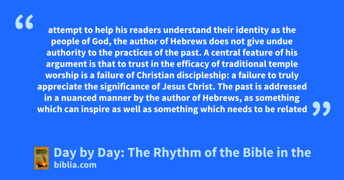 attempt to help his readers understand their identity as the people of God, the author of Hebrews does not give undue authority to the practices of the past. A central feature of his argument is that to trust in the efficacy of traditional temple worship is a failure of Christian discipleship: a failure to truly appreciate the significance of Jesus Christ. The past is addressed in a nuanced manner by the author of Hebrews, as something which can inspire as well as something which needs to be related