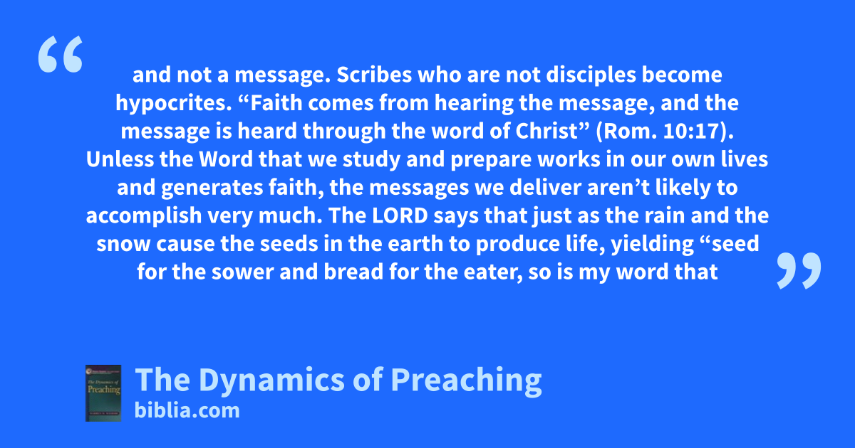 and not a message. Scribes who are not disciples become hypocrites. “Faith comes from hearing the message, and the message is heard through the word of Christ” (Rom. 10:17). Unless the Word that we study and prepare works in our own lives and generates faith, the messages we deliver aren’t likely to accomplish very much. The LORD says that just as the rain and the snow cause the seeds in the earth to produce life, yielding “seed for the sower and bread for the eater, so is my word that