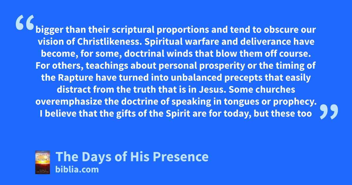 bigger than their scriptural proportions and tend to obscure our vision of Christlikeness. Spiritual warfare and deliverance have become, for some, doctrinal winds that blow them off course. For others, teachings about personal prosperity or the timing of the Rapture have turned into unbalanced precepts that easily distract from the truth that is in Jesus. Some churches overemphasize the doctrine of speaking in tongues or prophecy. I believe that the gifts of the Spirit are for today, but these too